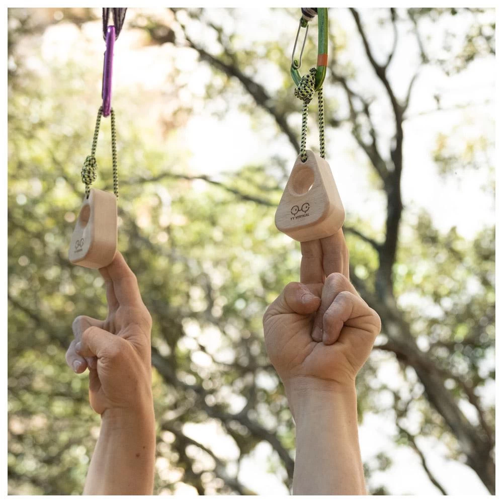 El YY Vertical Duo es una pequeña ayuda para escalar fabricada con madera reciclada para aislar el desarrollo muscular y tendinoso de uno o dos dedos. Tiene un dedo y dos dedos de sujeción de 25 mm de profundidad y puede utilizarse cargado ligeramente con un bungee o peso o suspendido como un peso corporal.