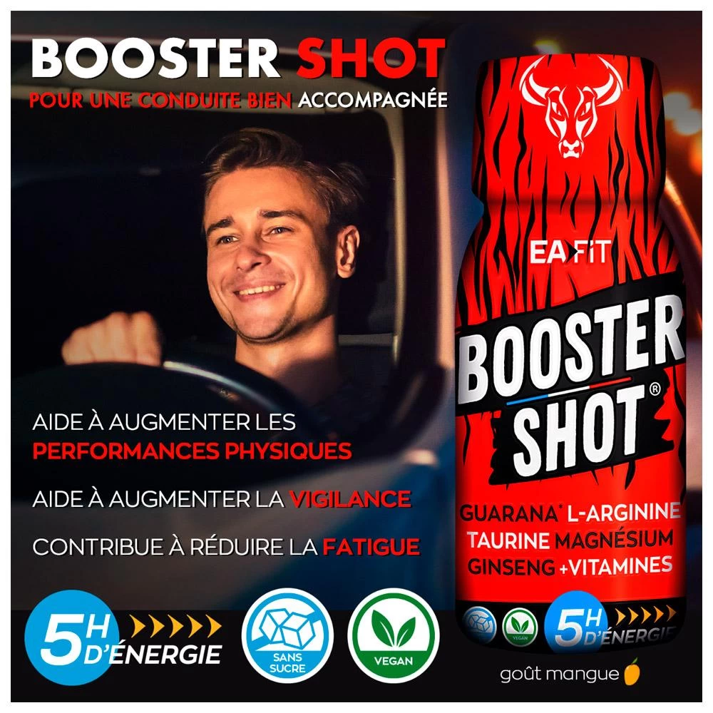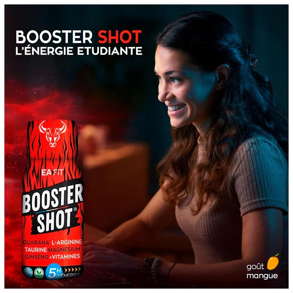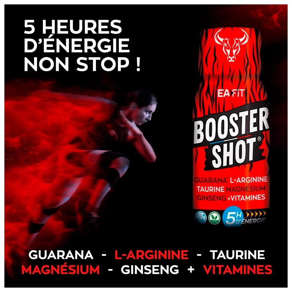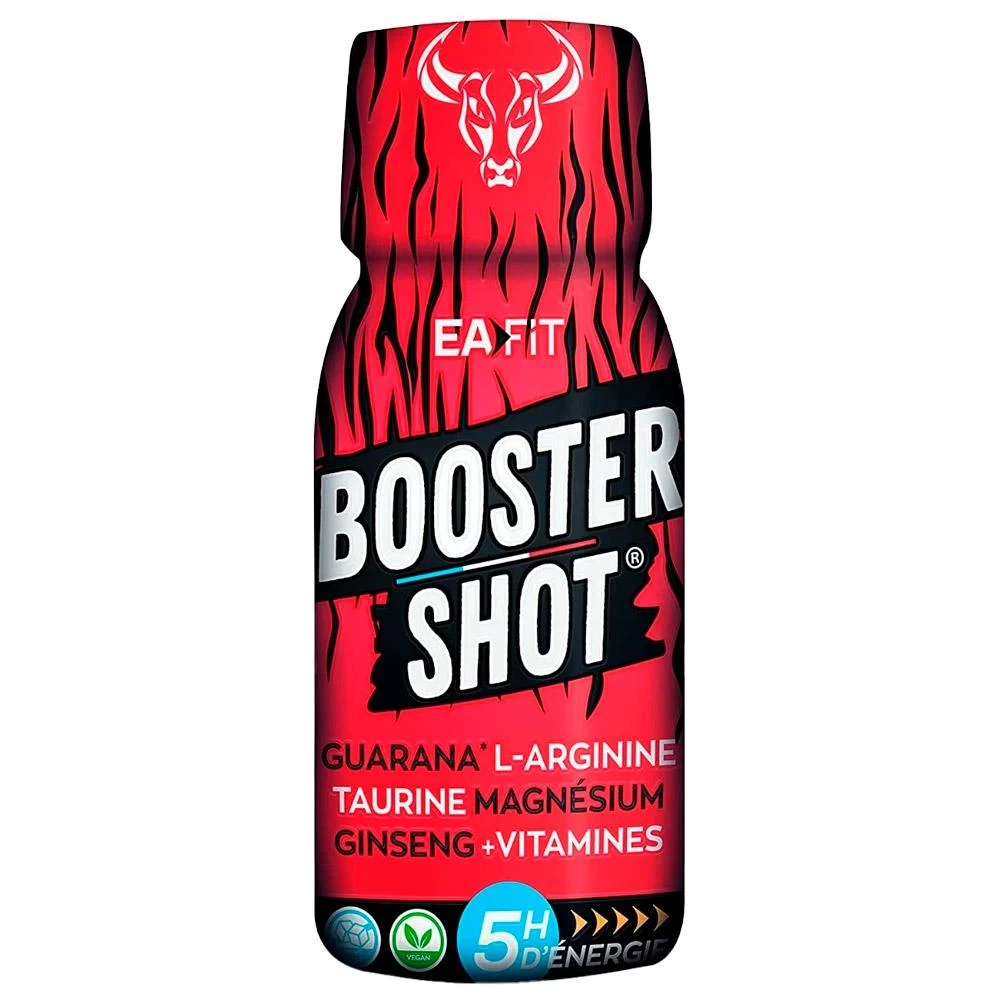 El EA FIT Booster Shot es una solución ideal para recuperar la energía en cualquier momento. Con su mezcla de guaraná, l-arginina, taurina, magnesio, ginseng y vitaminas, esta bebida lista para tomar con el gran sabor del mague ofrece hasta 5 horas de energía ininterrumpida para todas las actividades físicas y también intelectuales. Es fácil de llevar a todas partes gracias a su pequeño formato. Sin azúcares añadidos, este chupito está altamente concentrado en potentes principios activos y apto para veganos.