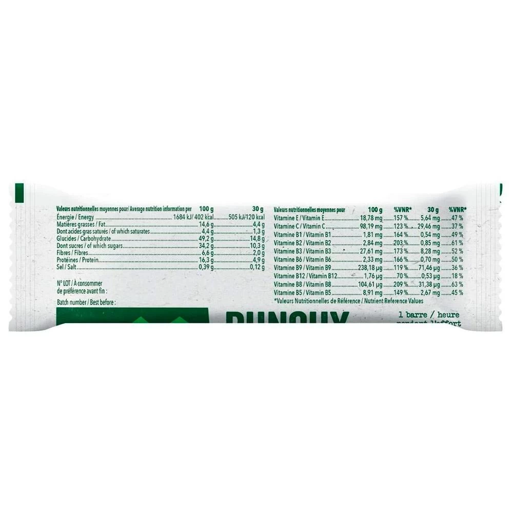 Protéine de lait, produit dérivé du lactosérum (lait), brisures de noisettes (sucre, noisettes grillées), humectant : sirop de sorbitol ; raisins secs, sirop de glucose, sucre, huile de palme, amandes (6%), sirop de sucre inverti, crème en poudre (lait), flocons de maïs (maïs, sucre, malt (orge), sel), graines de soja décortiquées, hostie (farine de blé, fécule de pomme de terre), protéine de soja, hulmectant : sorbitol, invertase; lait caramélisé en poudre (sucre, lait écrémé en poudre), huile de tournesol, arôme naturel, émulsifiant : lécithine de soja; vitamine C, niacine (vitamine B3), vitamine E, acide pantothénique (vitamine B5), riboflavine (vitamine B2), vitamine B6, thiamine (vitamine B1), acide folique (vitamine B9), bio- tine (vitamine B8), vitamine B12