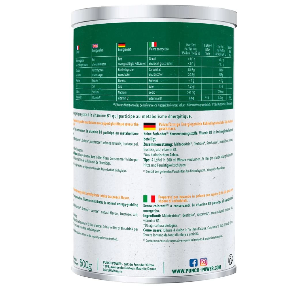 La bebida energética Biodrink 500 g de la marca Punch Power ayuda a mantener tu rendimiento y mejorar tu rehidratación. Fabricada en Francia, Biodrink 500 g está elaborada exclusivamente con ingredientes de cultivo biológico y no contiene gluten, colorantes ni conservantes. Además, contiene 45 mg/100 g de cafeína para un aporte de energía. Tenga en cuenta que este producto cumple con la normativa antidopaje.