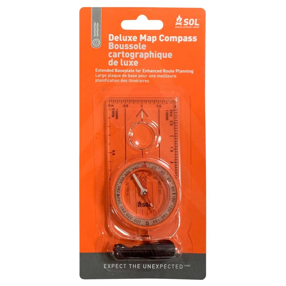 Disfruta del viaje con la brújula SOL Deluxe para tu próxima aventura. Utiliza su lupa para ampliar los pequeños detalles del mapa, aprovechando las graduaciones métricas e imperiales para mantener una lectura precisa. La cápsula rellena de líquido con anillo luminoso y la aguja son muy útiles con poca luz. Todo ello está contenido en una placa base con bordes redondeados que se adapta perfectamente a la palma de la mano. Esta brújula está diseñada para ser utilizada únicamente en el hemisferio norte. Consejo: Cuando utilice la brújula, manténgase alejado de cualquier objeto que contenga metal para evitar interferencias con la aguja magnética