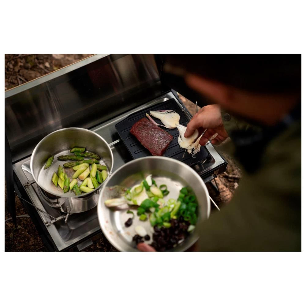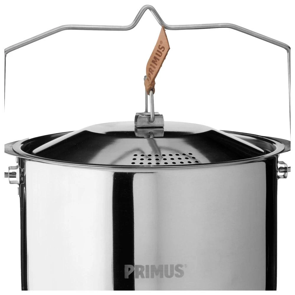 La Campfire Pot 3L de Primus es una olla de acero inoxidable de 3 litros que te permitirá preparar una gran cantidad de comida durante tus vivacs pero también en tu cocina cuando no estés fuera. Su tapa permite su uso sobre un fuego abierto y su mango es retráctil para un fácil almacenamiento.