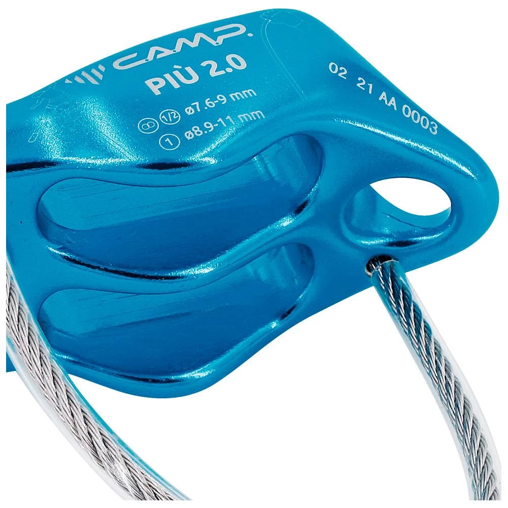 El Camp Più 2.0 es un asegurador para escalada deportiva que permite asegurar a una persona en top-rope o de primero. También se puede utilizar para asegurar uno o dos escaladores más. El cable diagonal evita que la cuerda roce o se enganche.