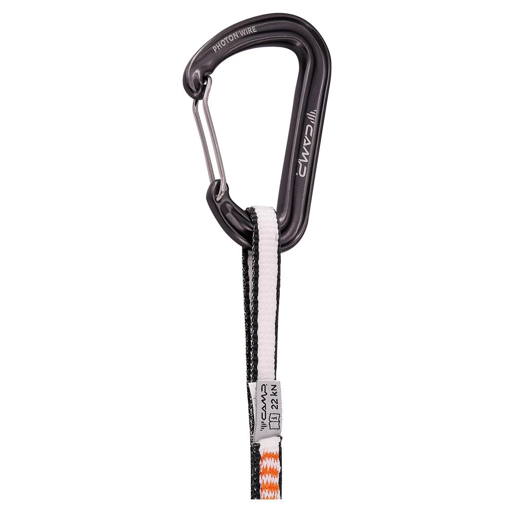 La escalera de escalada Photon Wire Express KS Dyneema de Camp, mostrada aquí con una correa de 18cm de largo y 11mm de ancho, es un modelo ultraligero que destaca entre sus competidores gracias al tamaño de sus mosquetones. De hecho, el mosquetón Photon Wire tiene una abertura un 25% más ancha que otros modelos de esta categoría, lo que facilita su uso. La cinta Dyneema, que ofrece más ventajas que el nylon en condiciones húmedas, está equipada con un bloqueador de mosquetón Karstop Evo que impide que el mosquetón gire.