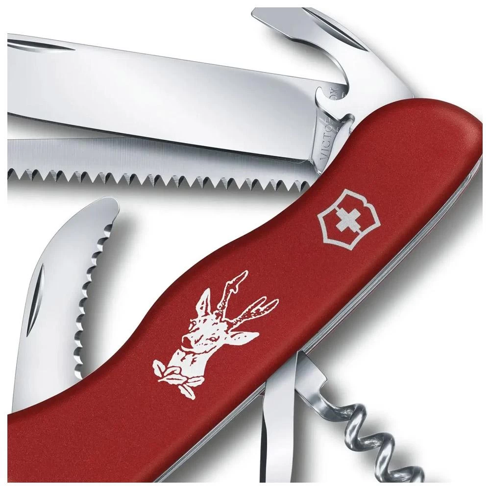 La Victorinox Hunter es una navaja suiza desarrollada para cazadores y otros entusiastas de las actividades al aire libre. La hoja grande, que se puede bloquear, es versátil y se complementa con una hoja pequeña para carnicería y una sierra para madera. El sacacorchos, el abrelatas y el abrebotellas son perfectos para socializar.
