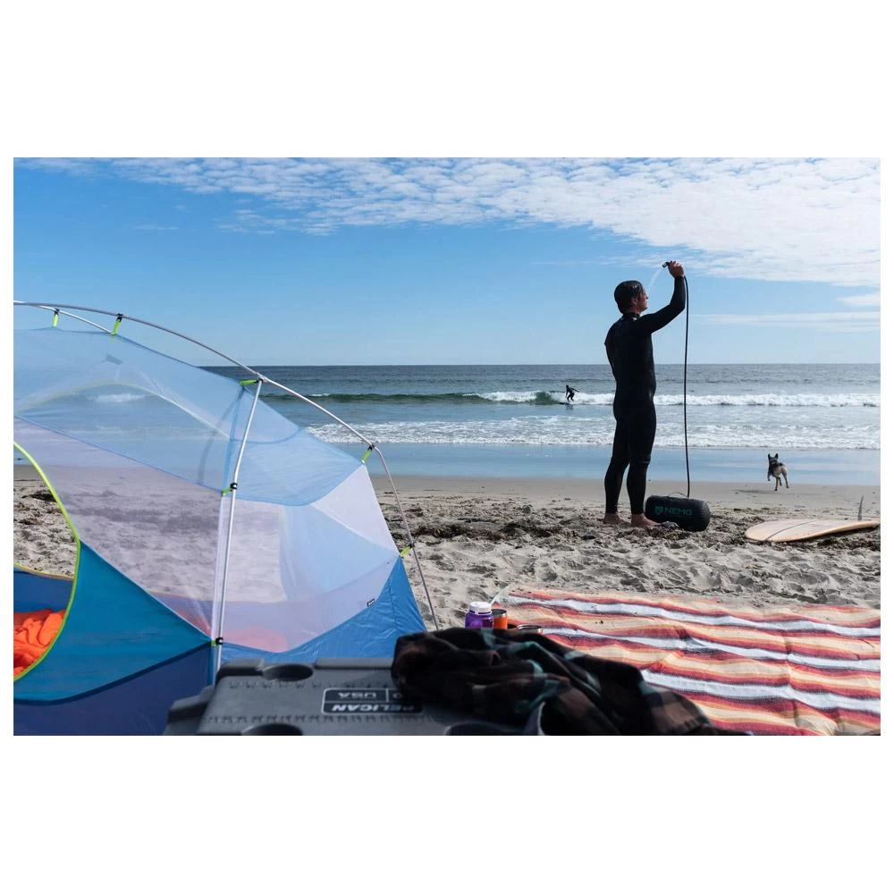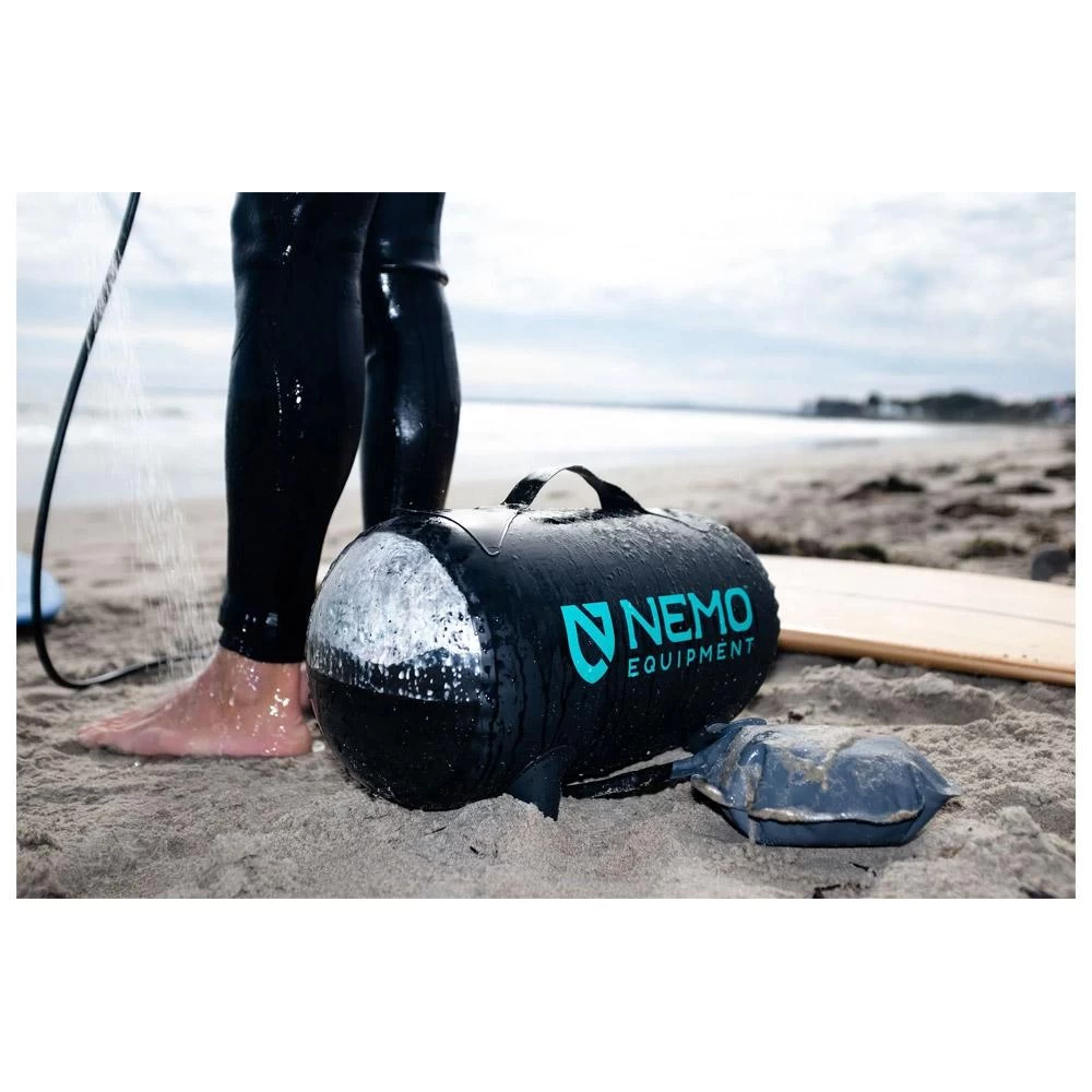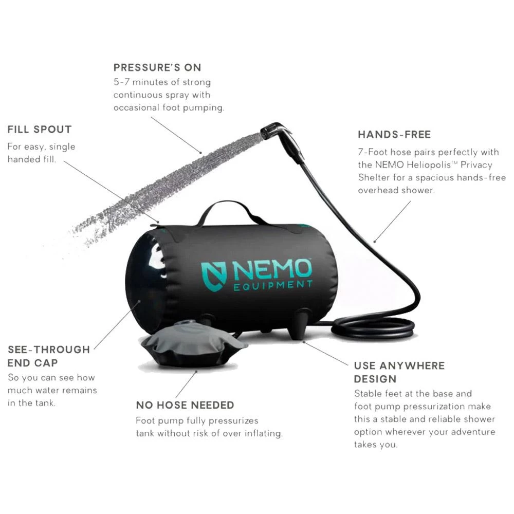 La ducha solar Nemo Helio tiene una capacidad de 11 litros de agua y su bomba de pie te permite presurizar el depósito para que puedas usarla dejándola en el suelo. El llenado es fácil y esta ducha te permite enjuagarte, ducharte o lavar los platos con un chorro continuo de agua durante 5 a 7 minutos (con bombeos ocasionales). La manguera es lo suficientemente larga para ducharse de pie y esta ducha solar es compacta cuando se pliega para facilitar el transporte.