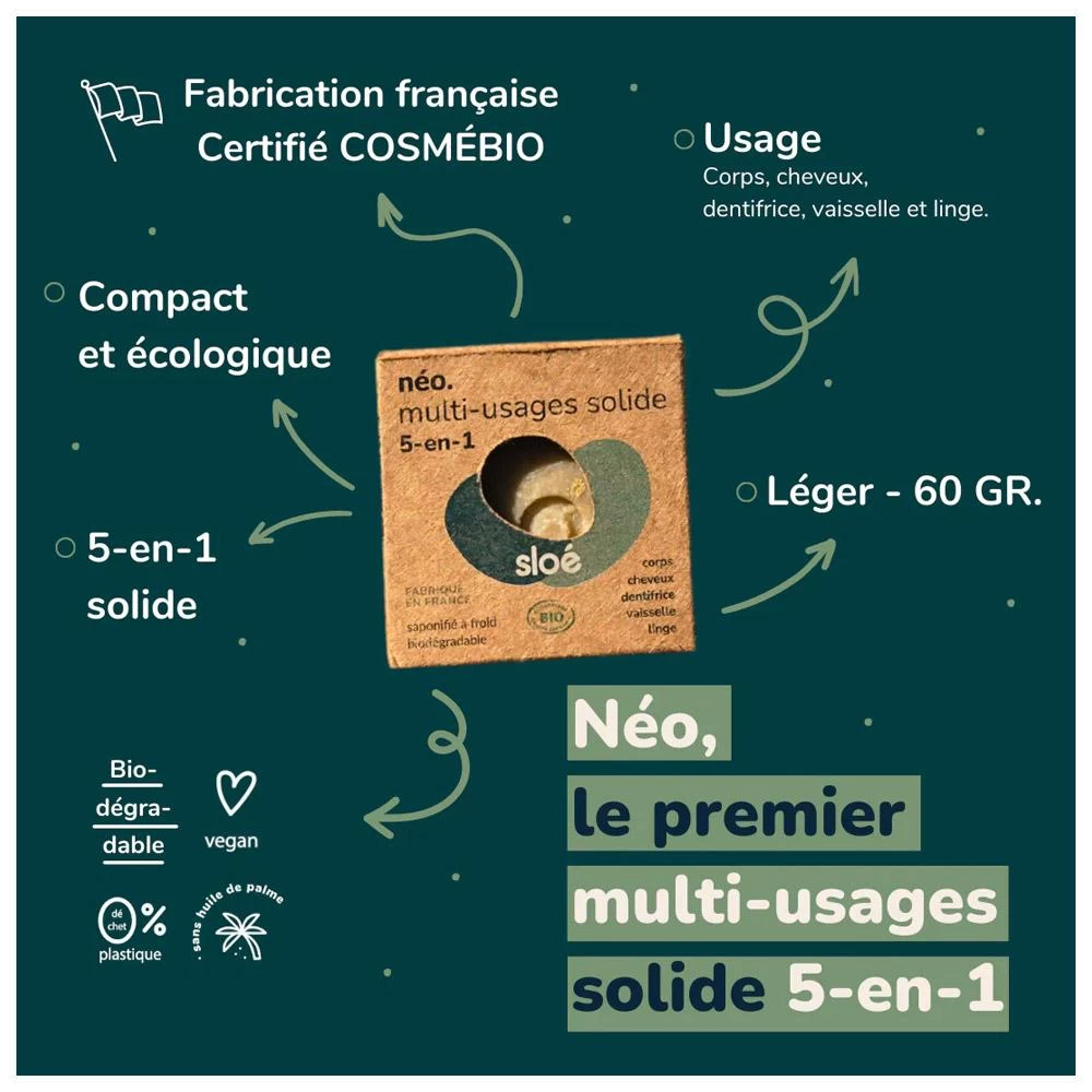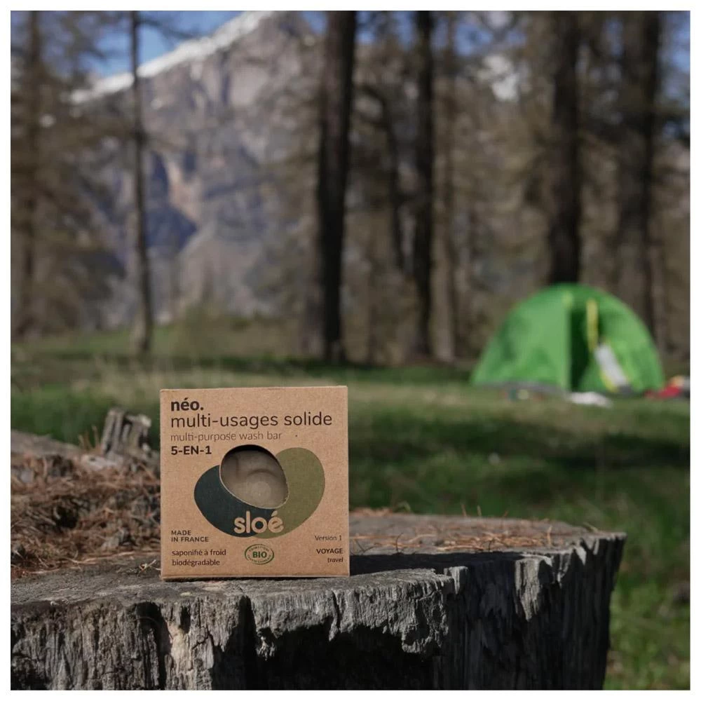 El Neo Multi 5 es un jabón versátil y natural que se puede llevar a todas partes cuando se practica senderismo, ciclismo, trekking, vivac, en una furgoneta…. Diseñado por Sloe, marca reconocida por la calidad de sus productos, este jabón es una auténtica navaja suiza de la limpieza. Es multiusos, por lo que puedes lavarte el cuerpo, la cara, el pelo, los dientes, la vajilla y la ropa. Con sus ingredientes 100% naturales, respeta tu piel y el medio ambiente. Se fabrica en Francia, en Givors, cerca de Lyon, y cuenta con las certificaciones Cosmebio y Cosmos Organic, lo que garantiza una ética y una calidad irreprochables.
