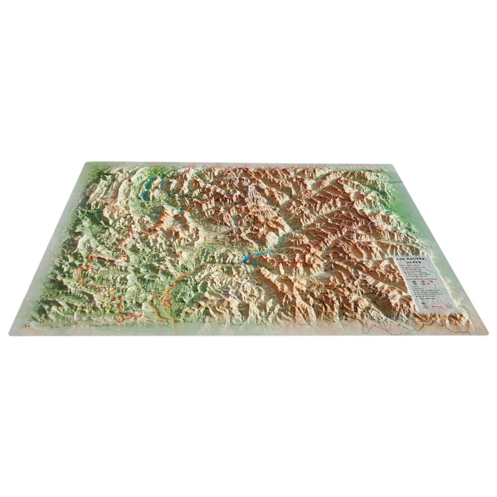 Los mapas 3DMAP se fabrican en Francia y aportan una nueva dimensión a la cartografía, tanto en sentido literal como figurado. Gracias a un software de procesamiento 3D desarrollado específicamente para estos mapas, se consigue un nivel de acabado excepcional que hace que estos mapas sean tan bellos como detallados. Y son los Altos Alpes los que se detallan en este modelo. Lugares turísticos que ver, sitios deportivos con lugares de despegue y aterrizaje de parapente, senderos GR, playas, campos de golf y ¡todo lo que pueda ser de interés!
