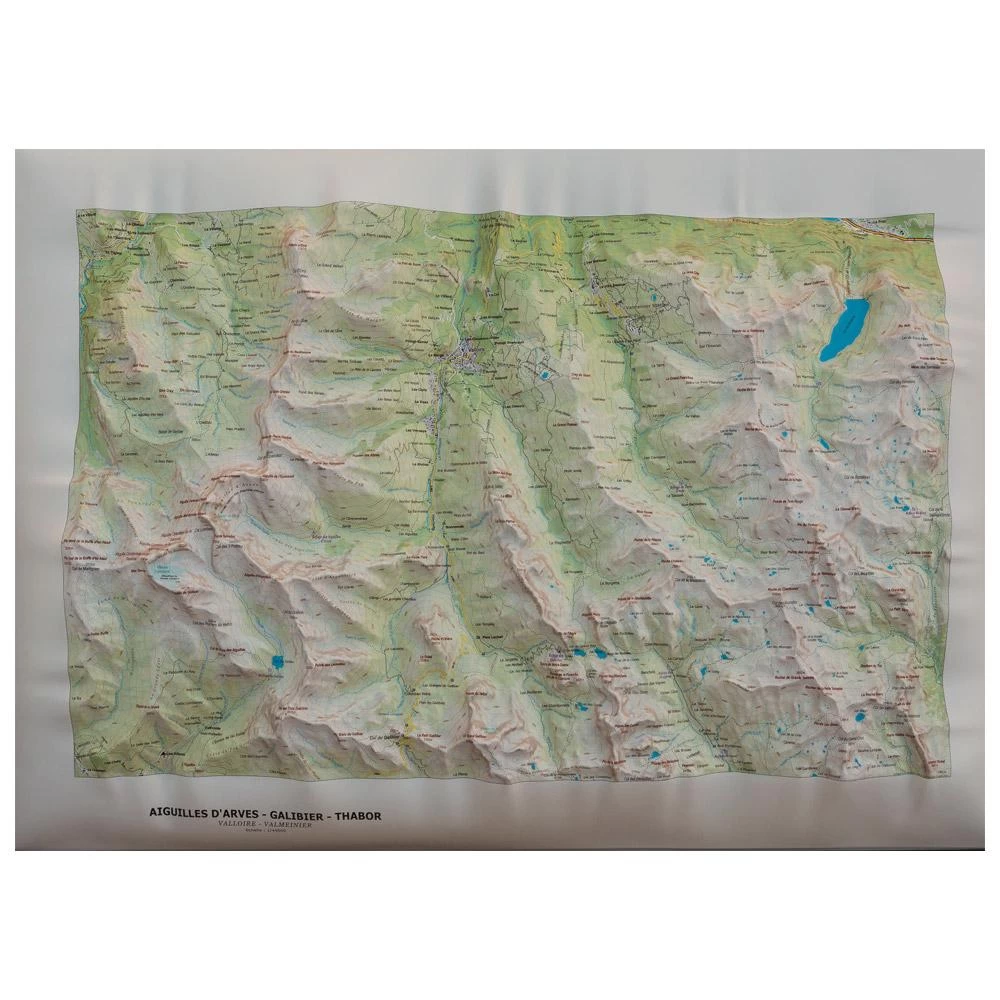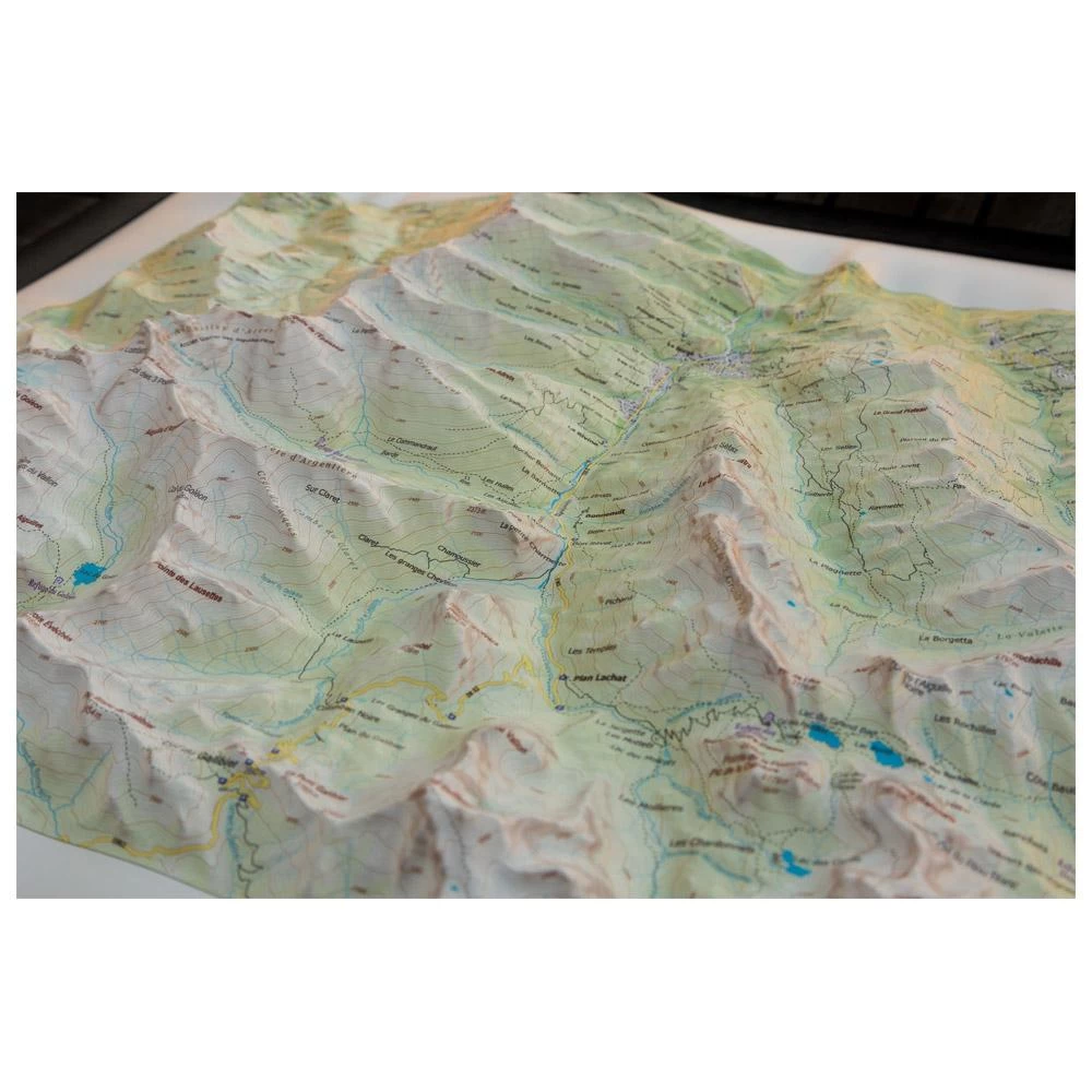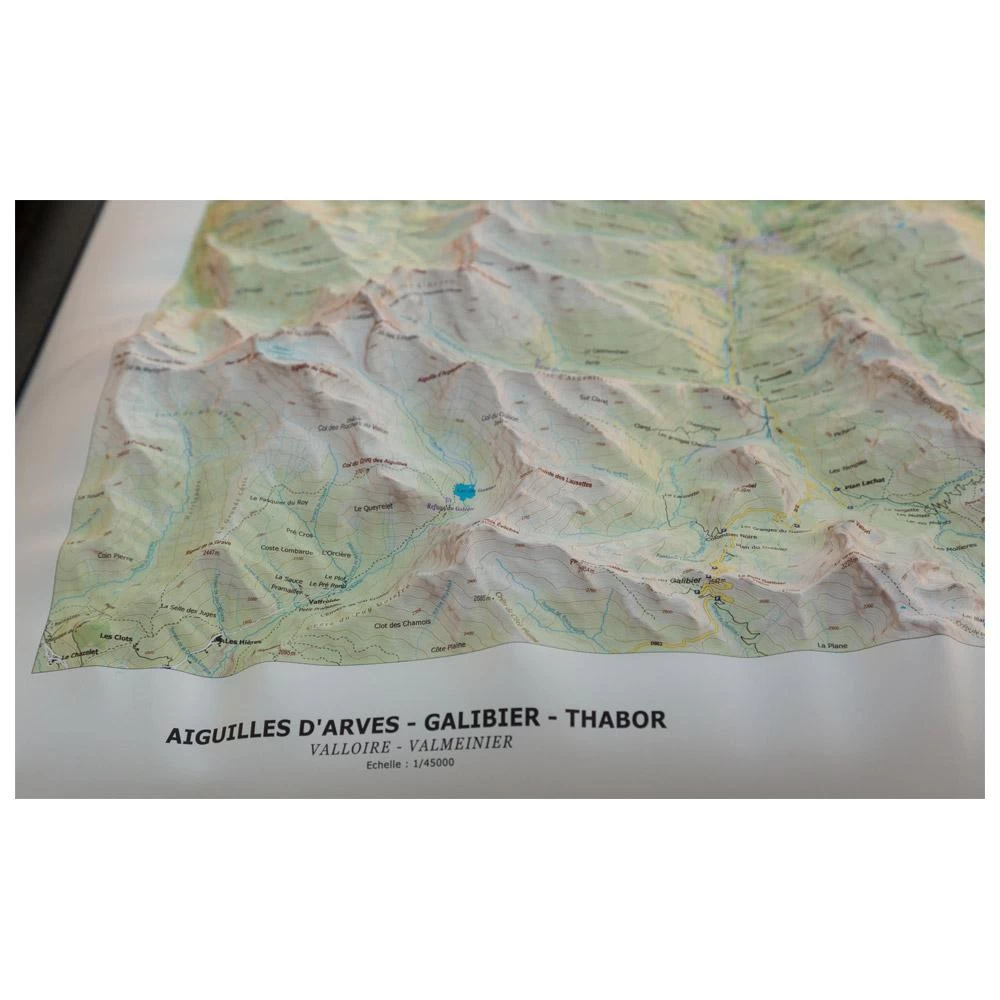 Este mapa mural en relieve realizado por Déniveles representa los macizos de Cerces, con los picos del Mont Thabor, Grand Galibier y las «Agujas de Arves». Este conocido macizo se encuentra en el extremo sur de Saboya, entre el valle de Maurienne y el macizo de Ecrins.