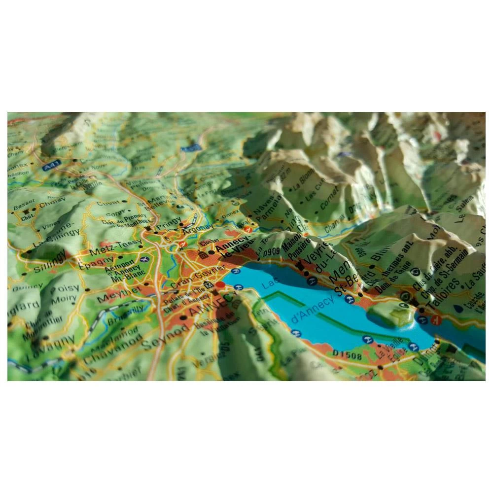 Los mapas topográficos 3DMAP se fabrican en Francia y aportan una nueva dimensión a la cartografía, tanto en sentido literal como figurado. Gracias al software de procesamiento 3D desarrollado específicamente para estos mapas, se consigue un nivel de acabado absolutamente excepcional, lo que hace que estos mapas sean tan bellos como detallados. En este mapa de Alta Saboya, podrás ver lugares turísticos como cascadas y cuevas que ver en la región, pero también encontrarás lugares deportivos con grandes excursiones que hacer como el Tour du Mont-Blanc.