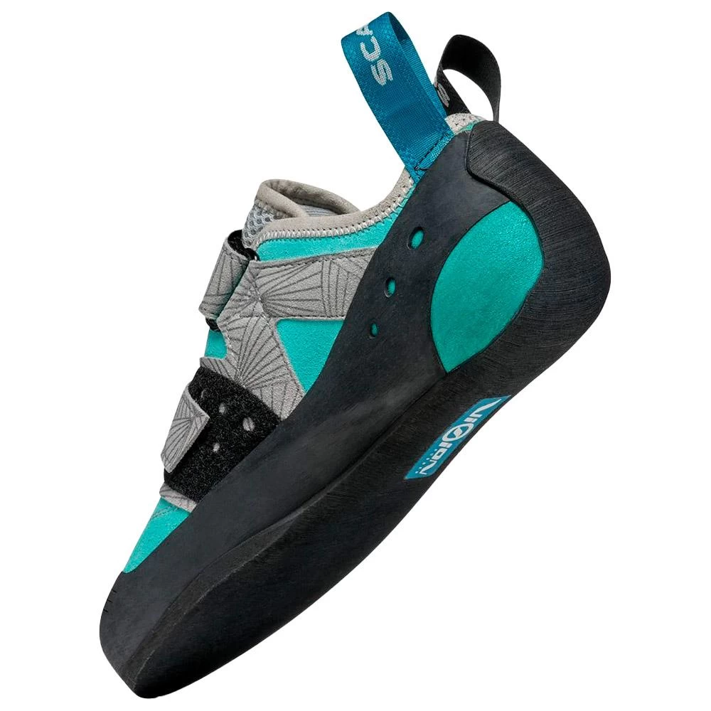 Tiene dos cierres de velcro que permiten ajustar el calce sin que el zapato brille en el pie. Se beneficia de un refuerzo en el talón que permite empezar a trabajar las presas de enganche, su sistema PAF asegura una buena distribución de la tensión de apriete y la suela Scarpa Vision proporciona un buen agarre a la vez que robustez.